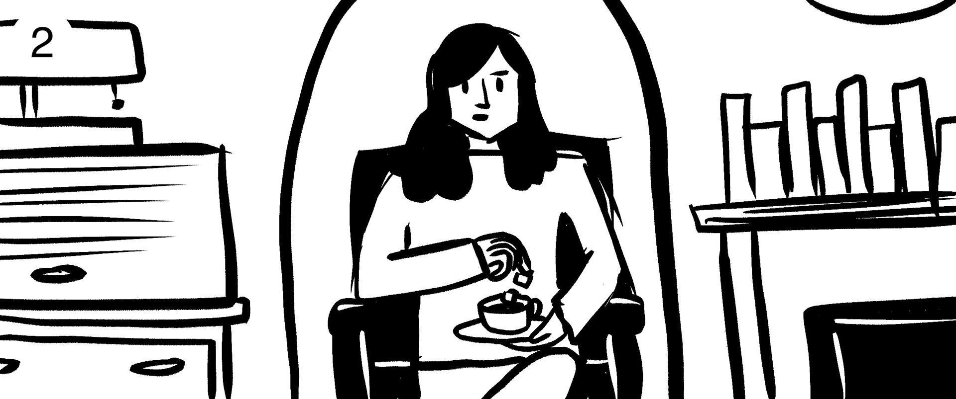 Missy puts two sugar cubes in her cup. She begins to stir slowly, CLINKING the SPOON softly and rhythmically against the sides of the cup.