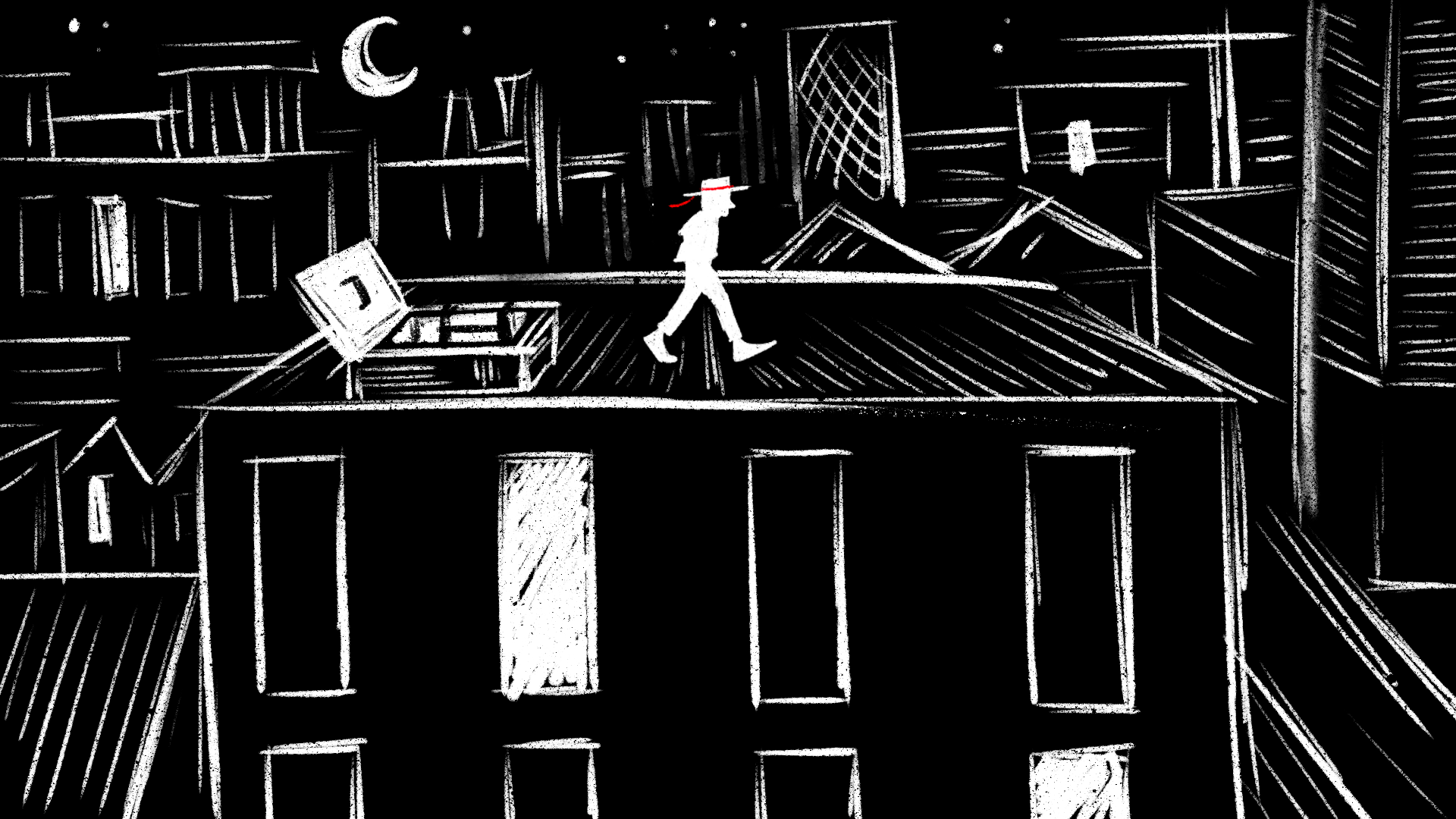 6. Wide/aerial shot looking down at rooftop, person walking across roof (door/bulkhead behind them).